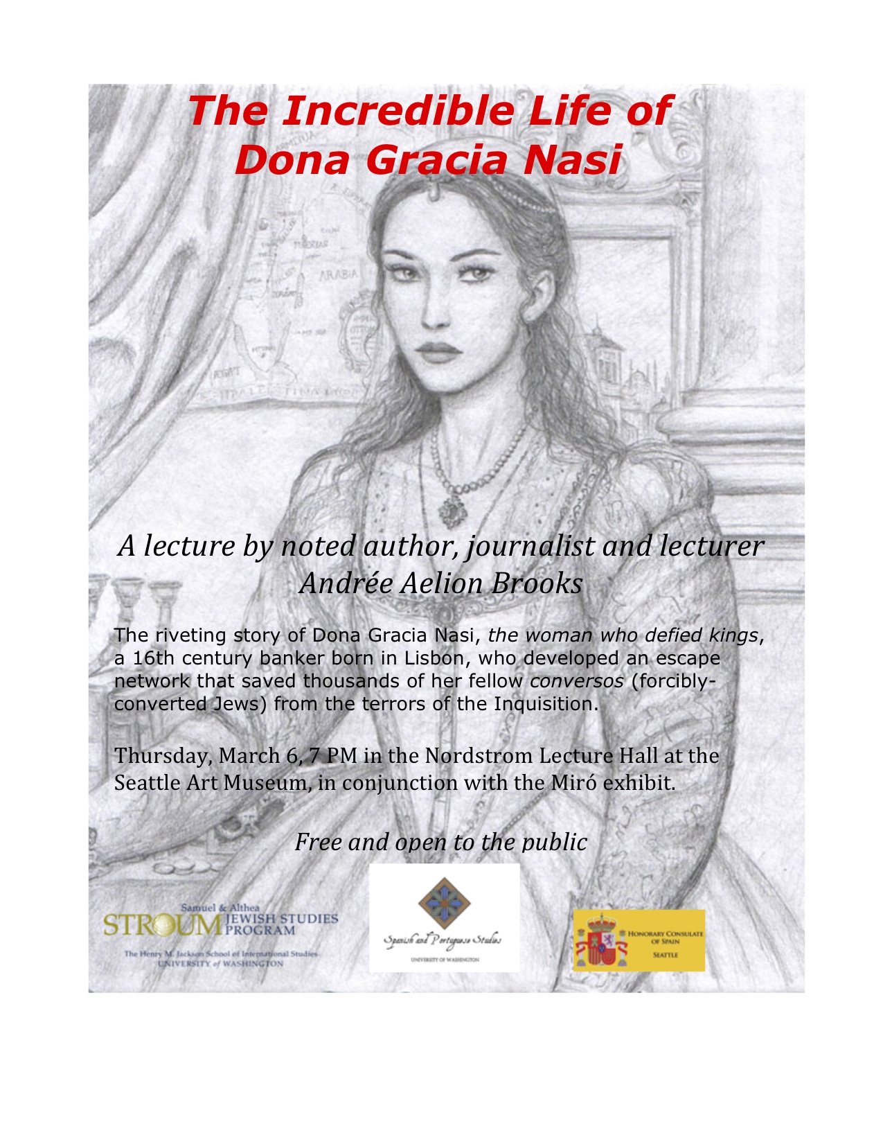 “The Woman Who Defied Kings: The Life and Times of Dona Gracia Nasi,” lecture by journalist Andrée Aelion Brooks at the Sam, March 6, 2014, at 7 pm. Sponsored by the Division of Spanish and Portuguese Studies as part of the Miro exhibition at the Sam, and co-sponsored by the Stroum Center for Jewish Studies and its Sephardic Studies Program. This event is free and open to the public.