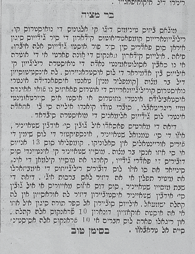 Article from the Salonican Ladino newspaper El avenir (1900) advocating for an enhanced bar mitsva that emulated those of a local Ashkenazi congregation
