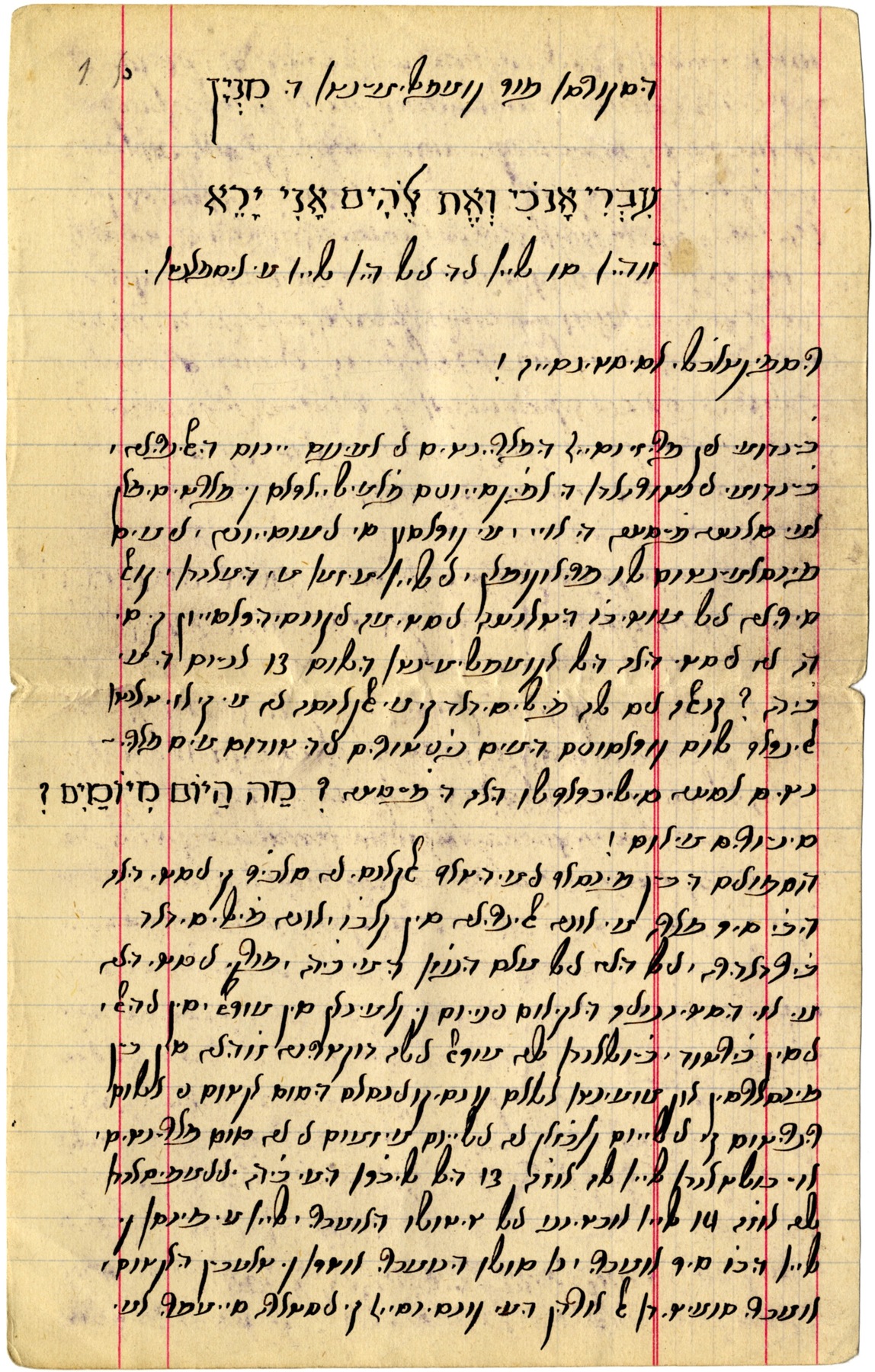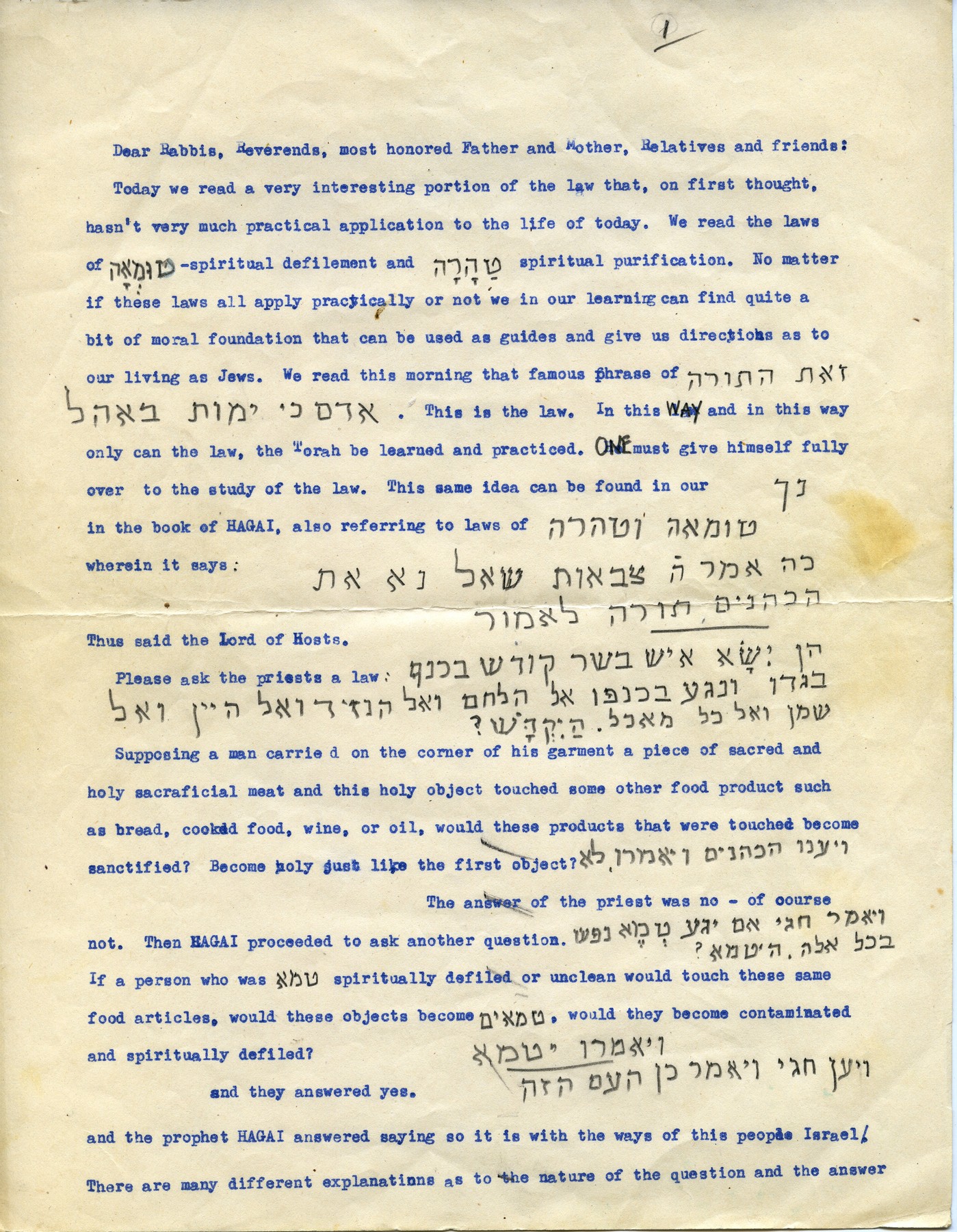 By 1935, expectations at Congregation Ezra Bessaroth had changed: Menache Israel, a first cousin of Charlie Alhadeff, turned thirteen that year and spoke in Ladino at his bar mitsva. His speech is preserved in two formats: one copy is written in soletreo, the Hebrew cursive script used by Sepharadim to write in Ladino, and the other is typed in Latin script. Since Israel could not read soletreo himself, it is likely that he read from the typed version at his bar mitsva.6