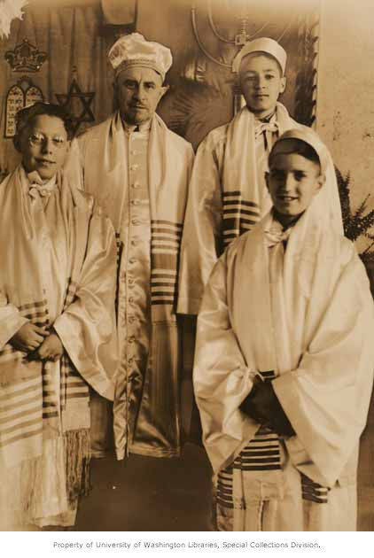 Rabbi Isidore Kahan (second from left) with bar mitsva boys at Seattle’s Sephardic Bikur Holim Congregation, 1939. University of Washington Libraries, Special Collections.