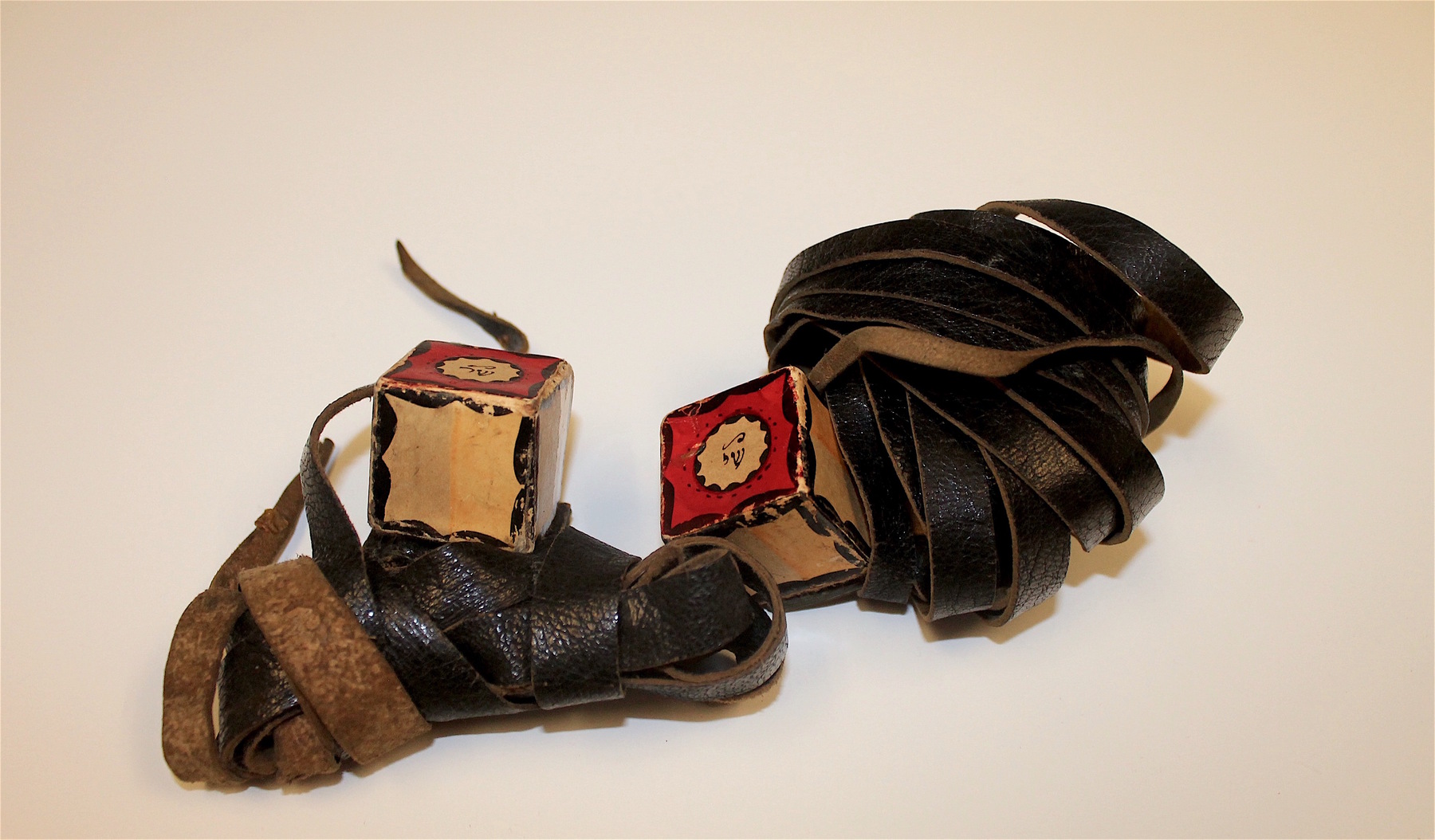 Set of tefilin first donned on the day of a boy’s bar mitsva. These tefilin are from the Island of Rhodes, once home to a large Sephardic community before the Holocaust. Courtesy of Al Shemarya.