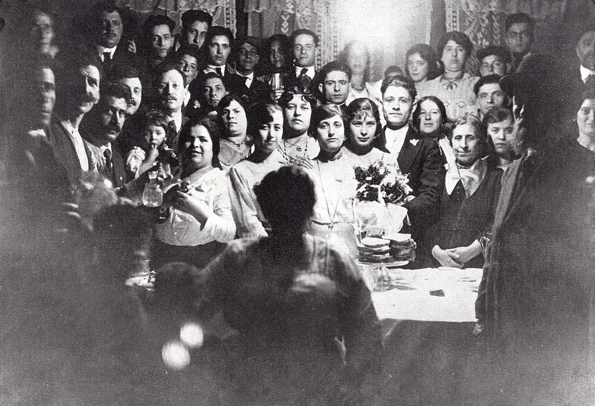 Wedding party at a home in Seattle to celebrate Moshe and Behora Alhadeff, 1920. Courtesy of Leo Shahon.