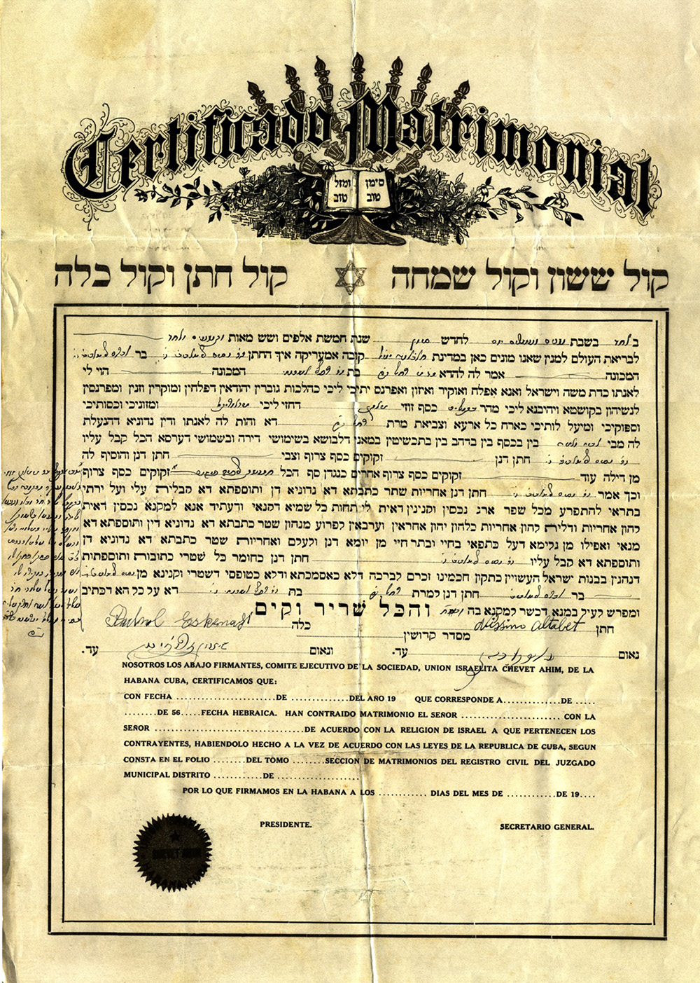 Certificate on aged paper with ornate top labeled "Certificado Matrimonial" with menorah, book, and leaves with printed Hebrew rashi script below
