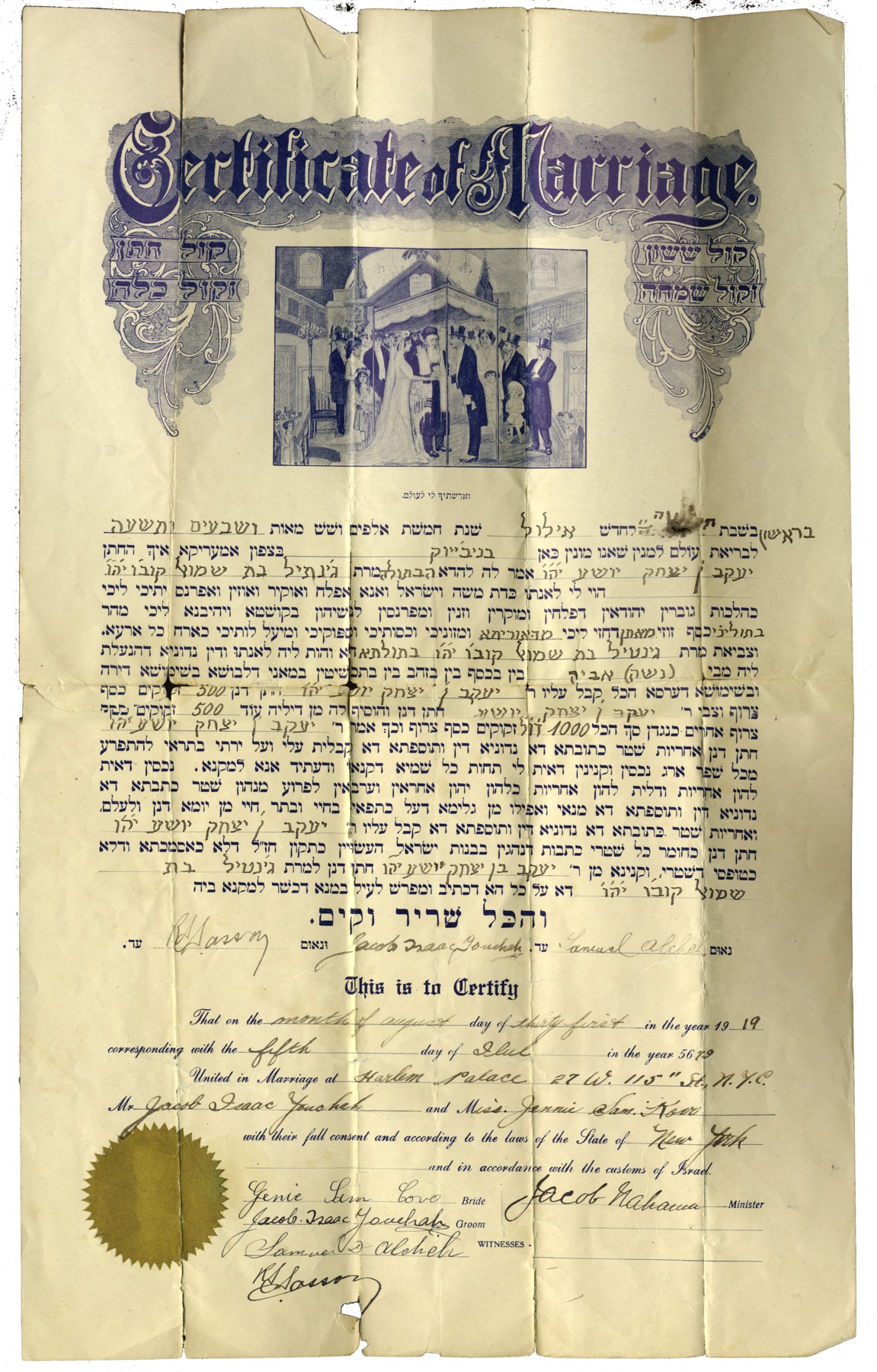 Ketuba from the wedding of Jenie Covo to Jacob Youchah in New York, 1919. Courtesy of Elayna J. Youchah