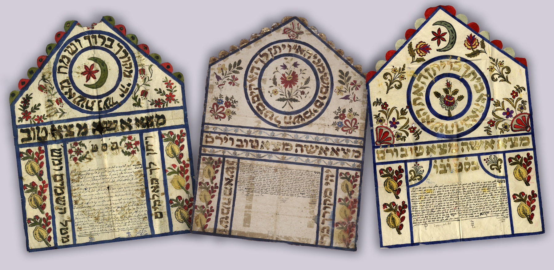 Collage of three ornate ketubot with triangular arched tops, with painted flowers and moons and golden highlights