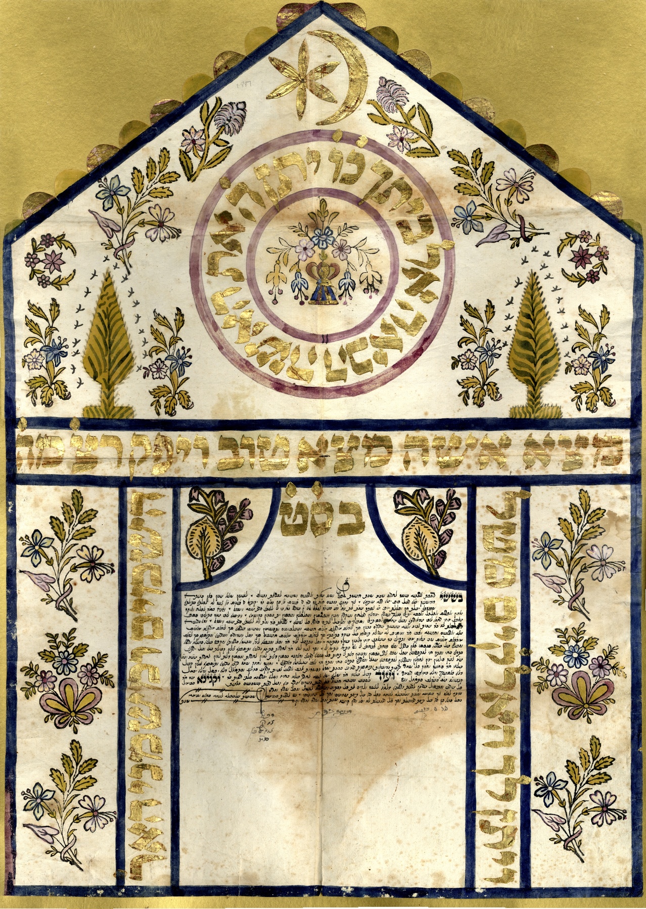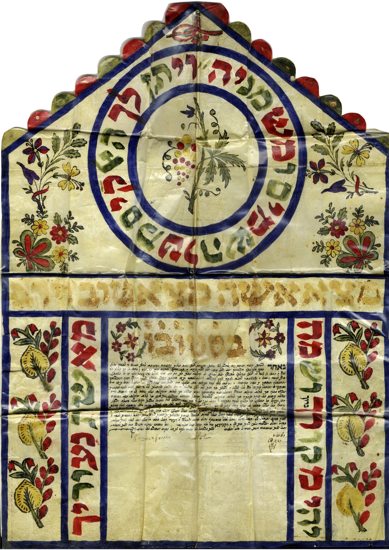 There are few decorations that immediately characterize a home as uniquely Jewish. Perhaps a mezuza (the covered scroll containing the text of the shema) affixed outside the house, would be the most indicative of the Jewish life within. But adorning many Jewish homes next to family photos and framed paintings hangs different kind of identifier: the ketuba, or Jewish marriage contract. Even without being able to decode the Aramaic text that is at the center of the ketuba, the decorative Hebrew verses surrounding its borders have signaled the Jewish identity of its owners for centuries.