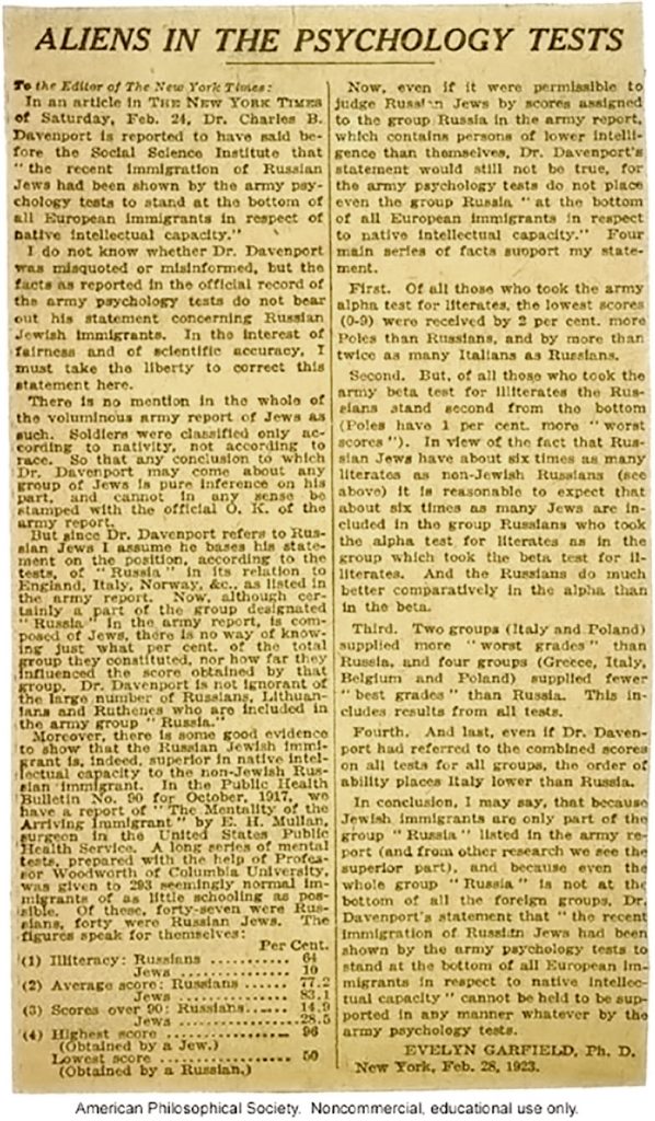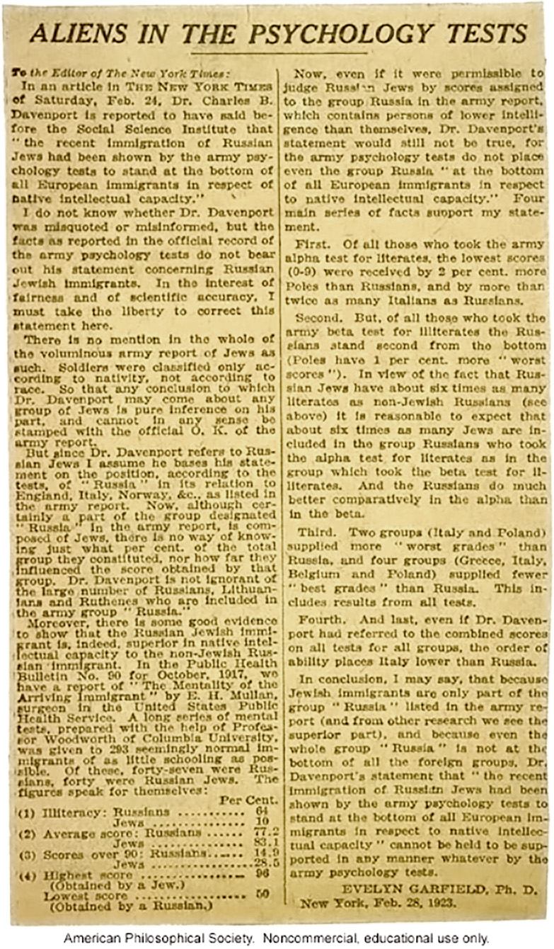 Evelyn Garfield, Ph.D., writes a letter to The New York Times debunking recently published claims that Russian Jews had “low intellectual capacity.” February 1923. Via the American Philosophical Society.