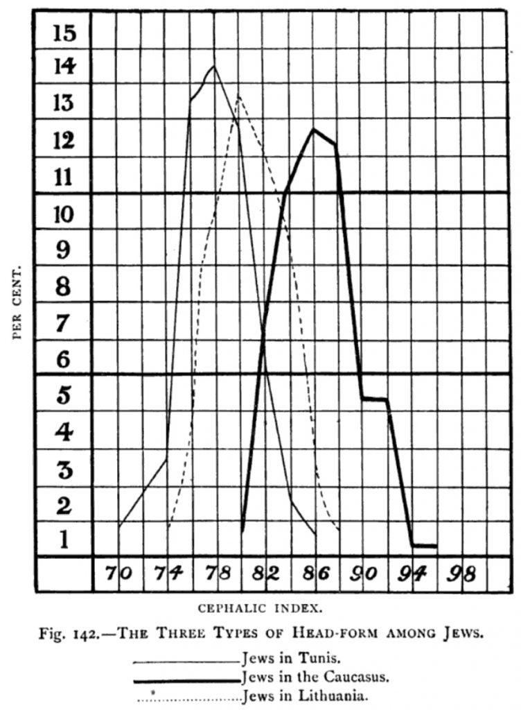 “Cephalic index.” A graph charting head sizes of Jews from different regions, from Maurice Fishberg’s “The Jews: A Study of Race and Environment,” 1911.