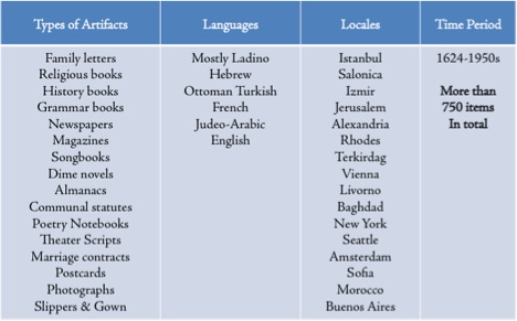 The SSDC showcases a wide array of published and unpublished materials, including novels, prayer books, bibles, manuscripts, letters, newspapers, magazines, songbooks, poetry, theater scripts, marriage contracts, photographs, postcards, and books on religion, history, grammar and more. In addition to Ladino, the languages contained in these documents include Hebrew, Aramaic, Turkish, Arabic, Yiddish, French, English, Greek and Italian. Most of the artifacts originated in the former Ottoman Empire, while others were published in Vienna, Livorno, Seattle, New York, Baghdad, and Amsterdam. The first samples of the digital artifacts are available through the University of Washington Libraries Digital Collections.
